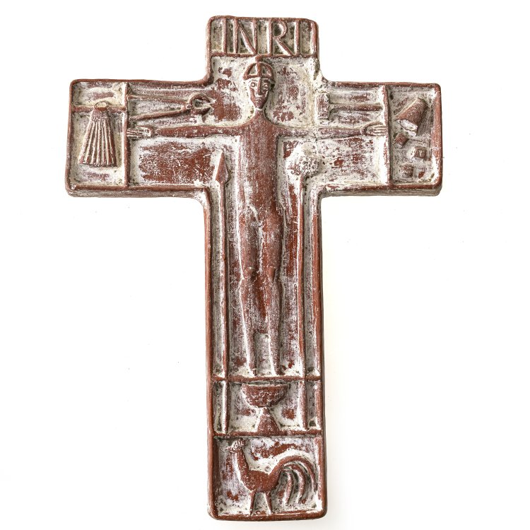 Rötlicher Ton, Darstellung des Gekreuzigten mit Arma Christi in reliefartiger Ausführung. 33,5 x 25,3 cm. Minim. Alterungsspuren.