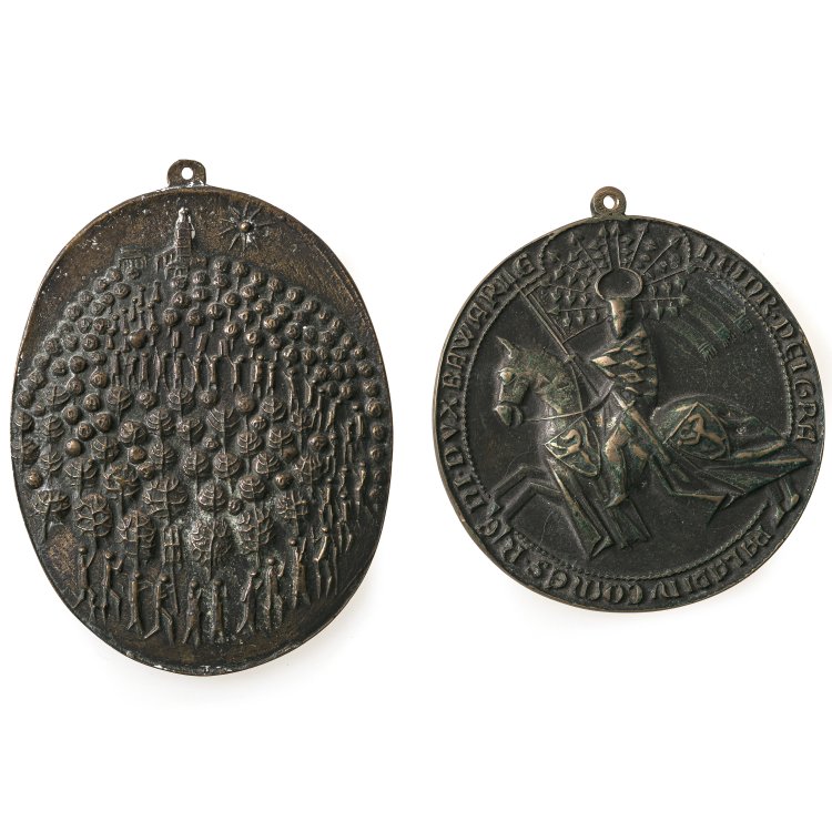Zwei Bronzeplaketten, mit Aufhänger gearbeitet. Darstellung einer Pilgerprozession zum Bogenberg und eines bayerischen Ritters. Eine Plakette sign. 11,5 x 8,5 cm und 9,5 x 9 cm. Patina.