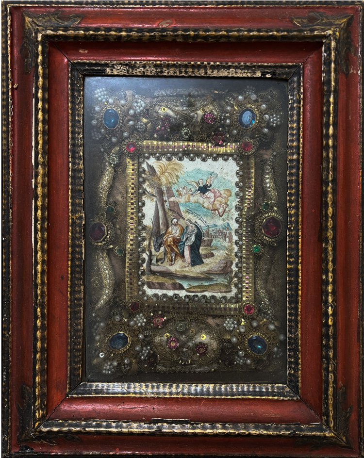 Süddt., 18. Jh. Mittig Aquarell auf Pergament mit Darstellung "Flucht aus Ägypten". Umgeben von Gold- und Silberdrahtarbeit, Kunstperlen und farbigen Glassteinen. Mit zwei Reliquien. 26 x 17 cm, mit Rahmen 39,5 x 31,5 cm. Alterungsspuren.