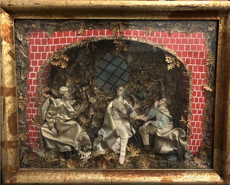 Kerkerszene. 30,5 x 39 cm. Stoff, Krüll, Glitter.