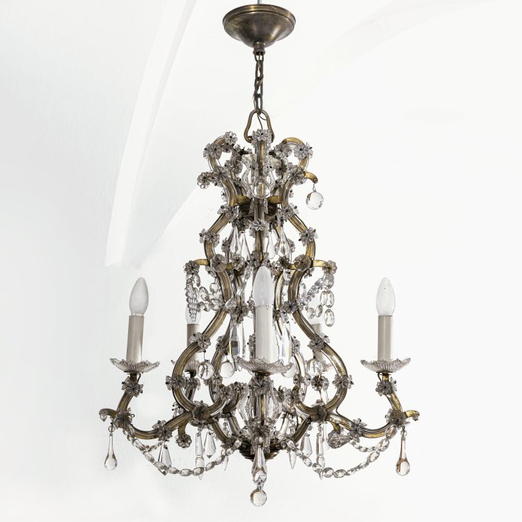 Verglastes Korbgerüst mit Glasrosetten und ovalen Glaskettengirlanden, mittig Baluster mit Prismenbekrönung aus Glas, 5-flammig. Elektr. Teile lose, besch. H. ca. 70 cm, ø ca. 55 cm.
