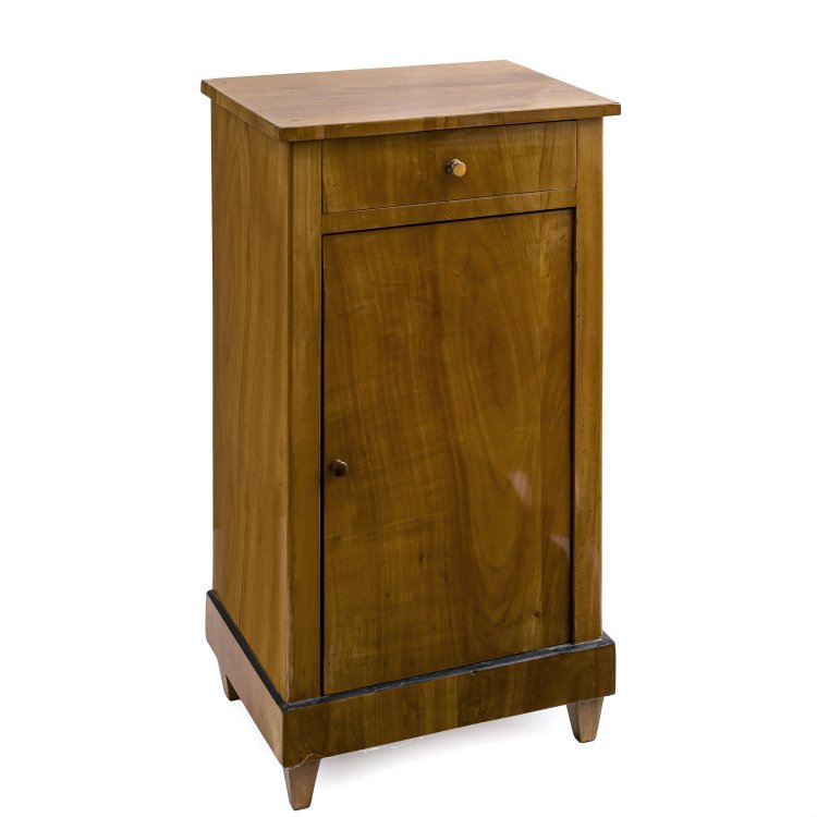 Kirschbaum, furniert. Eine Tür, ein Schub, Sockelprofil geschwärzt. Knäufe erg., kleine Furnierschäden, rest. 87 x 44 x 32 cm.