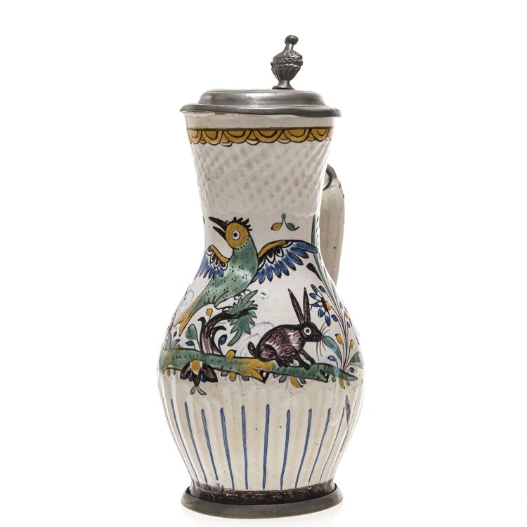 Niederösterreich, 2. H. 18. Jh. Birnkrug, Fayence. Hellbrauner Scherben, partiell geprägt und geritzt. Weiße Zinnglasur, Darstellung von Flora und Fauna, mit Hasen und Vogel, in manganvioletter, grüner, kobaltblauer und ockergelber Scharffeuerbemalung. Zinnmontierung, ungemarkt, teilw. ergänzt. H. 24 cm. Best. Unterseitig Pinselmonogramm "NF".