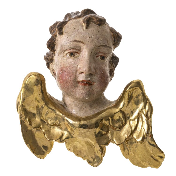 Österreich/Süddtl., Anfang 19. Jh. Geflügelter Engelskopf, rücks. summarisch gearbeitet. Holz, geschnitzt, übergangene Inkarnat- und Goldfassung. Ca. 23 x 21 cm. Minim. Alterungsspuren.