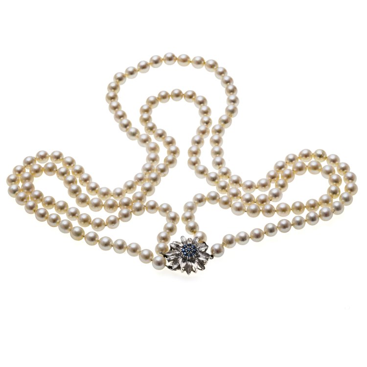 Zuchtperlen, gleichmäßig (ø à ca. 7 mm), Schließe 14 K WG (gestempelt) in Form einer Blüte, mit Saphirbesatz. L. 60 cm.