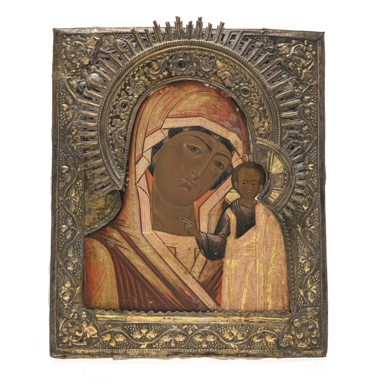 Russland, 19. Jh. Ikone der Gottesmutter von Kasanskaja. Tempera/Holz und Messingoklad mit getriebenem Dekor, u.a. Weinlaub. 33 x 27 cm. Alterungsspuren, minim. best.