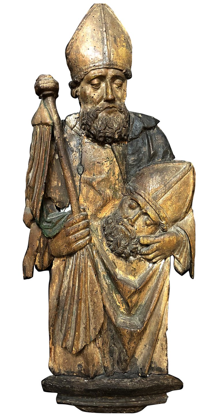 Der Hl. Dionysius mit seinem Kopf unter dem Arm und einer Fahne. Relief. Holz, min. Reste der alten Fassung. Rep., besch. H. 62,5 cm.
