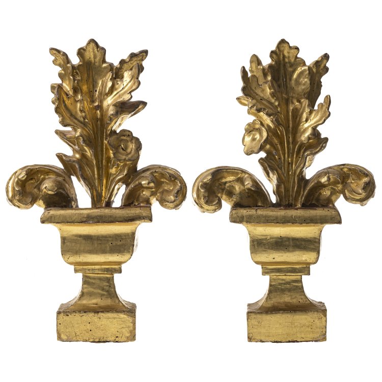 Süddeutsch, 18./19. Jh. Ein Paar Altarvasen. Holz, geschnitzt, übergangene Vergoldung, schauseitig gearbeitet. Akanthusblattwerk. Alterungsspuren, best. H. 39,5 cm.