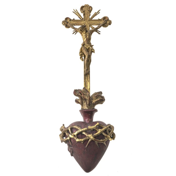 Süddt., 19. Jh. Holz, geschnitzt. Übergangene Farb- und Goldfassung. Herz Jesu und Jesus Christus am Kreuz. Rücks. flach gearbeitet, zur Aufhängung. 26,5 x 18 cm und 34 x 17 cm. Alterungsspuren, rep.
