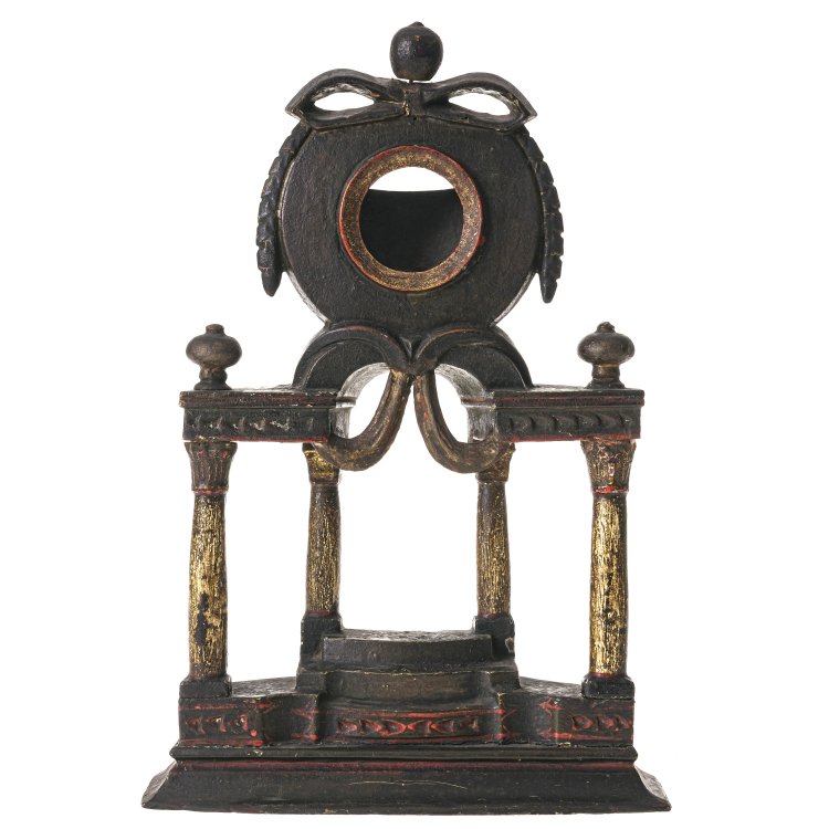 1. H. 19. Jh. Holz, geschnitzt, farbige Bemalung. Klassizistischer Architekturaufbau mit vier Säulen und Festons. Minim. besch. H. ca. 29,5 cm.
