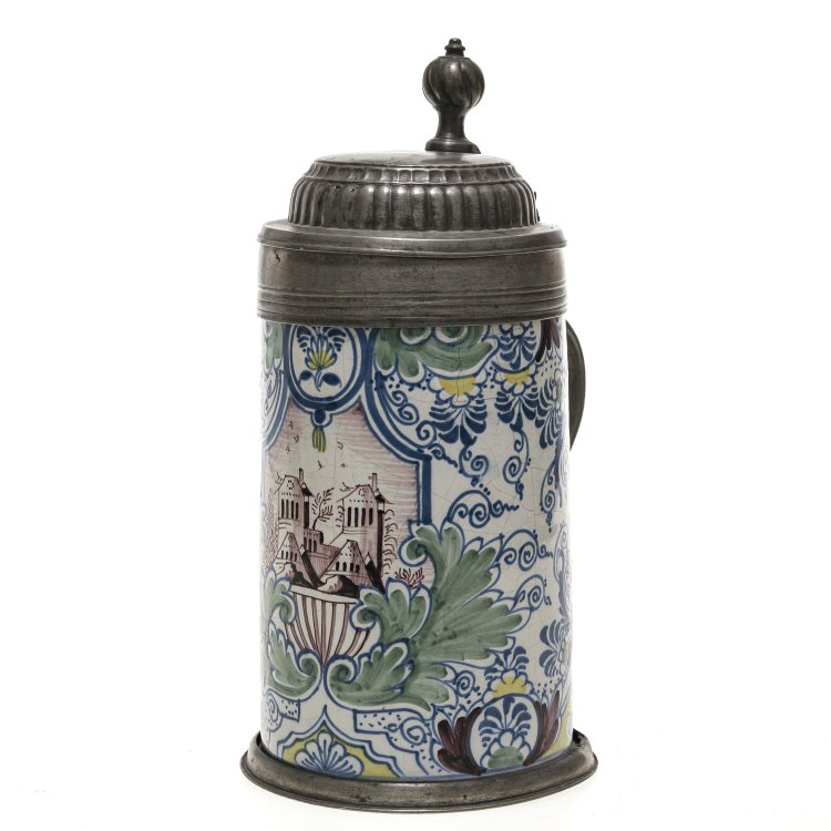 Wohl Thüringen (Erfurt), 18./19. Jh. Walzenkrug aus Fayence mit Dekor in Blau, Grün, Mangan und Gelb. Kartusche mit Architektur. Zinndeckel und Zinnmontierung, rep. Feine Haarrisse in der Fayence, best. Ohne Marke. H. ca. 25 cm.